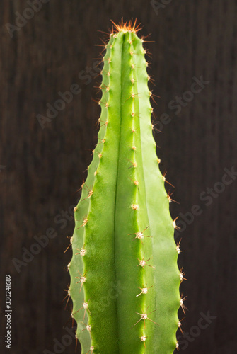 © Ludmila, Naklejka premium Fragment of a mini-cactus Cereus validus (wax candle) on a black wooden background.