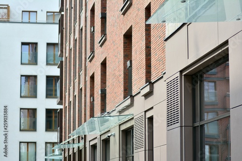 © Grand Warszawski, Naklejka premium Fragment of a modern apartment building in front. Very modern apartment house.