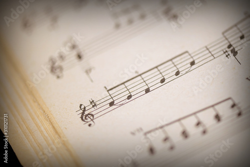 © Talulla, Fototapeta premium Fragment of a page from an old musical notebook on a dark surface close-up. Music background retro style toned