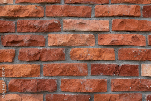© Анатолий Еремин, Obraz premium Fragment of a red brick wall with picturesquely chipped edges. Rustic. Background. Texture.