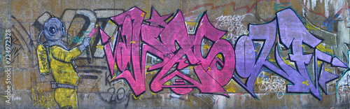 Fototapeta premium Fragment of graffiti drawings. The old wall decorated with paint stains in the style of street art culture. Scary scuba diver