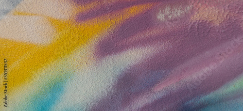 Obraz premium Fragment of old plaster wall with graffiti painting. Part of colorful street art graffiti on wall background. Youth, urban culture. Yellow, green, purple, light blue colors