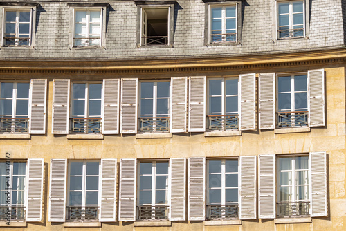 © Евгения Смульская, Fototapeta premium Fragment of the facade of a historic building in the center of Paris.