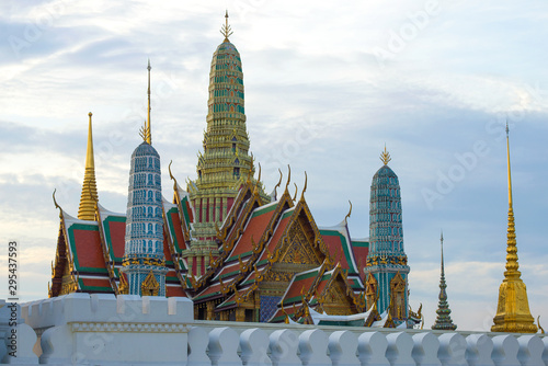 © sikaraha, Naklejka premium Fragment of the old Grand Royal Palace on evening twilight. Bangkok, Thailand