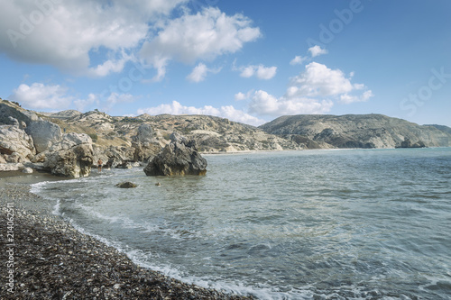 Naklejka premium fragment of the stony beach of Aphrodite against the background of mountains and blue sky