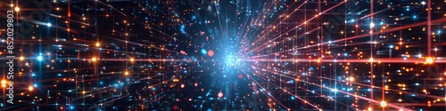 © Bilas AI, Naklejka premium Fragmented grid pattern with broken connections on a dark background, illuminated by scattered neon lights for a tech-inspired look