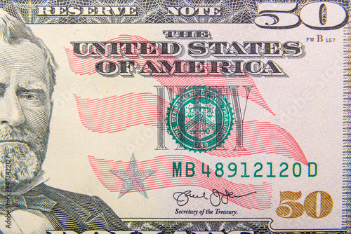 © finist_4, Fototapeta premium Fragments close-up a fragment of a fifty dollar bill.