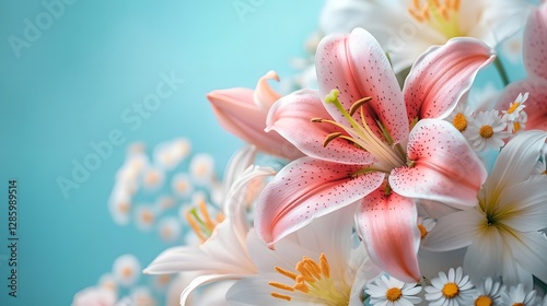 Fototapeta premium Fragrant Pink and White Lily Blossoms in Soft Floral Bouquet