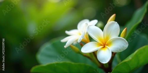Fototapeta premium Fragrant white frangipani blooms in tropical garden, plant, tropical