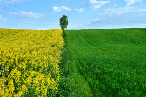 Fototapeta premium Frame divided in half between fields of green grain and yellow rapeseed