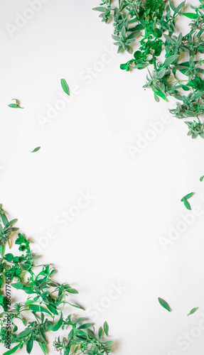 © Natali, Naklejka premium frame from green branches, leaves on a white background. flat lay, top view.