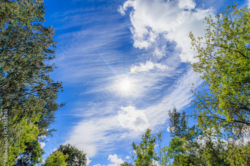 © alenka2194, Obraz premium Frame green tree branches against the blue sky. Natural nature trees and blue sky. Copy space. Tree branch.