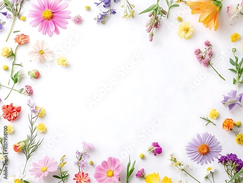 © SBAPNA- GRAPHIC, Naklejka premium Frame made of colorful flowers on white background. Flat lay, top view