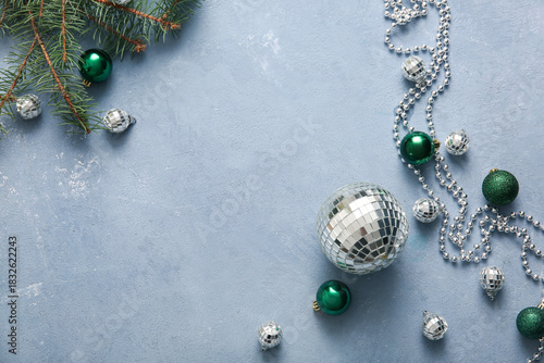 Naklejka premium Frame made of disco balls, fir tree branch and Christmas decor on blue grunge...