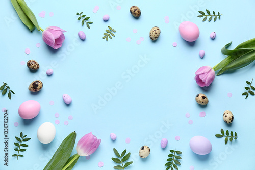 Obraz premium Frame made of Easter eggs, green leaves and flowers on blue background