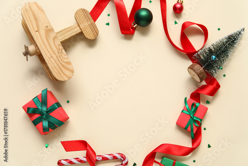 Obraz premium Frame made of gift boxes, red ribbon and wooden airplane on beige background. Christmas vacation concept