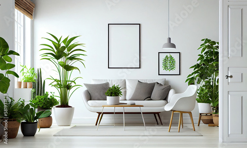 Naklejka premium Frame mockup empty on wall in living room with sofa and houseplants. Generative AI