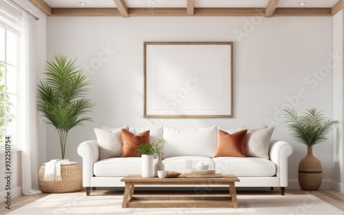 © Hendry, Fototapeta premium Frame mockup in bright living room design, white sofa in farmhouse boho interior style, 3d render