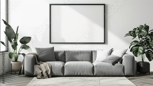 Fototapeta premium Frame mockup, ISO A paper size. Living room wall poster mockup. Interior mockup with house background. Modern interior design. 3D render