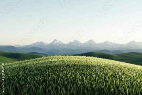 © walaiporn, Fototapeta premium Frame mockup on a grassy hill, rolling plains ecosystem with distant mountains, 3D illustration