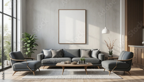 Obraz premium Frame Mockup on Living Room Wall, Modern Interior Design with 3D Render.