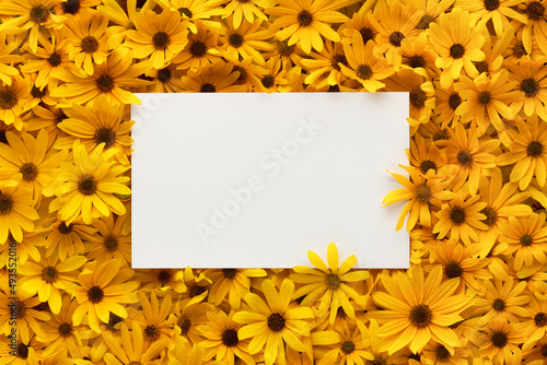 Obraz premium Frame of bright and warm yellow summer flowers with blank white postcard for text.