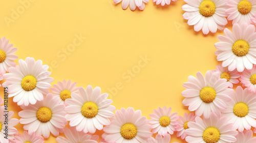 © PaulShlykov, Naklejka premium Frame of chamomiles, branches, leaves and lilac petals on white background. Flat lay, top view Generative AI