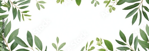 © Pink Zebra, Naklejka premium Frame of eucalyptus branches, green leaves on a white background, Concept for cards, greeting cards, invitations. wide banner panoramic. top view, copy space