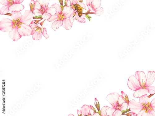 © Tishina, Naklejka premium Frame of hand-painted watercolor illustration of fruit tree blossom with bees on flowers. The theme of farming, spring, bees, apiary, honey. Ideal for seasonal holidays, weddings, children's themes.