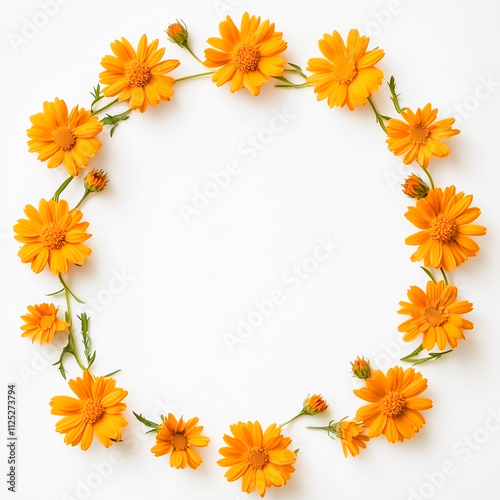 © agrus_aiart, Obraz premium Frame of orange flowers on white background. Flat lay, top view