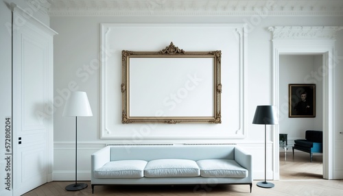 © AlexRillos, Fototapeta premium frame poster mockup on the wall, modern and well decorated living room interior