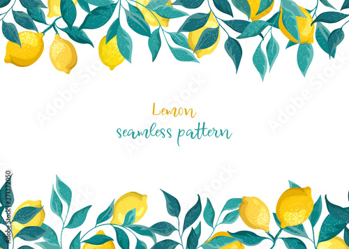 © Darya, Fototapeta premium Frame, seamless pattern of lemons and leaves with flowers on a white background. Summer illustration, copy space.