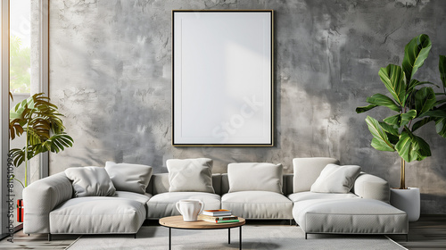 © Ameer, Fototapeta premium "Frame Template, A4 Paper Size. Living Room Poster Preview. Interior Setup with House Background. Contemporary Home Styling. 3D Rendering."