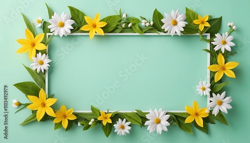 © Maria, Obraz premium frame with flowers with green background for greetings invitation, spring season