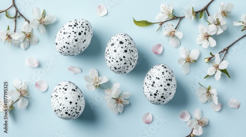 © Johannes, Fototapeta premium Frame with white and blue speckled easter eggs and cherry blossoms on light blue background. Happy Easter concept. Simple spring template, greeting card, banner. Top view, flat lay with copy space