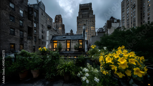 © Issara, Naklejka premium framed by a foreground of flowering plants on a rooftop