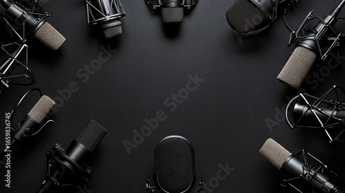 Naklejka premium Framed composition with condenser mics and regular microphones around the corners of a deep black background, leaving the center open and empty.