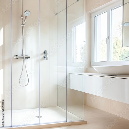 © Photography09, Obraz premium Frameless glass shower with simple chrome fixtures, minimalist bathroom fixtures, sleek modern look