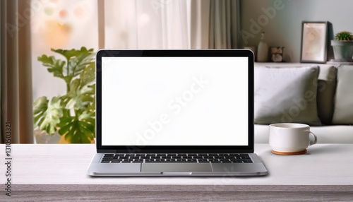 © netsay, Fototapeta premium Frameless Modern Laptop Mockup on a Minimalist White Wooden Table, Blending Seamlessly into Modern Home Interiors Perfect for Digital Art, Design Templates, and Inspiration.
