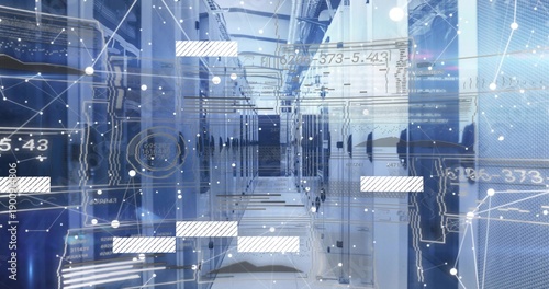 Fototapeta premium Framing central aisle running through data center, highlighting server racks and digital overlays
