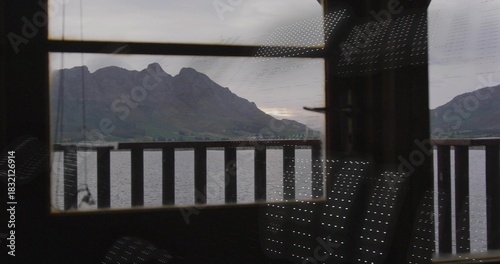 Naklejka premium Framing jagged mountain ridge and calm lake through window in dim cabin, with railing reflections