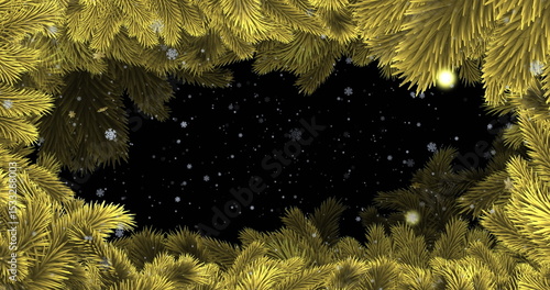 © vectorfusionart, Obraz premium Framing yellow-green pine branches around dark sky in night forest canopy, with snowflakes falling