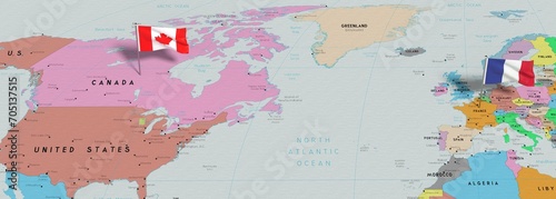Fototapeta premium France and Canada - pin flags on political map - 3D illustration