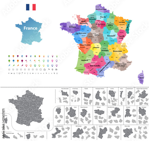 © brichuas, Obraz premium France map colored by regions vector illustration