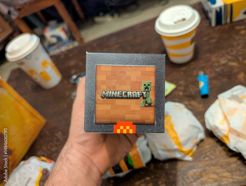 © Henry Saint John, Fototapeta premium France, 25 March 2025 : Minecraft themed merchandise alongside food and drinks on table.