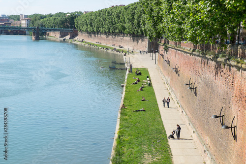 Fototapeta premium France, Toulouse, near the Pont Neuf bridge, Henri Martin promenade adjacent to the Garonne River, young couples share time together and individuals lie in the sun looking at their cell phones.