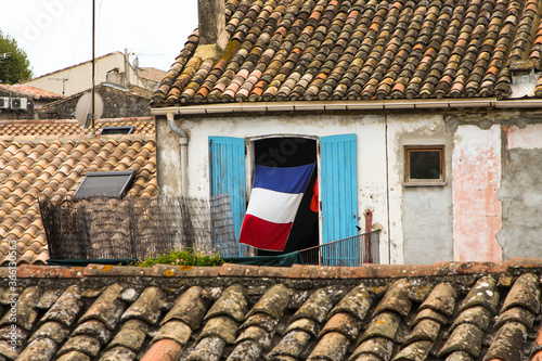 Fototapeta premium Francja , Prowansja , sierpień 2019 , drzwi z flagą francuską budynku w...