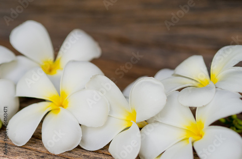 Naklejka premium Frangipani flower/ Plumeria/ Temple Tree/ Graveyard Tree / wood background