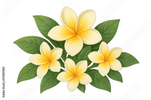 © PNG Kingdom , Naklejka premium Frangipani flowers in bloom with tropical leaves, symbolizing relaxation, summer, and exotic growth on transparent background