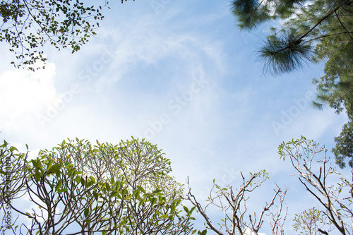 © taira42, Obraz premium Frangipani tree flower on blue sky background